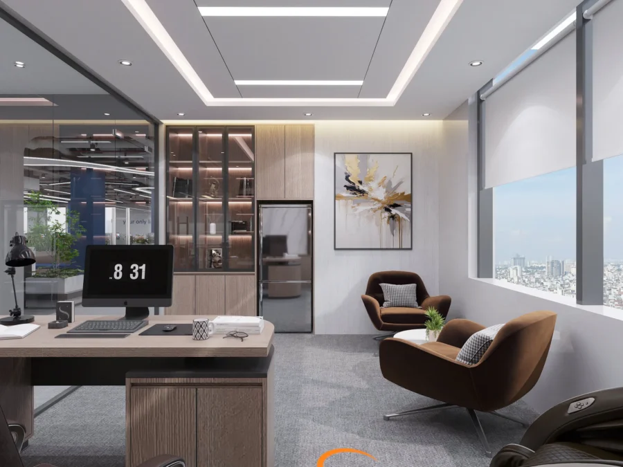 - Nội thất phòng làm việc của Chủ doanh nghiệp: 1 bộ bàn ghế làm việc thể hiện phong cách, quyền lực của người đứng đầu. Bên cạnh là bộ bàn ghế tiếp đãi khách và đối tác.
